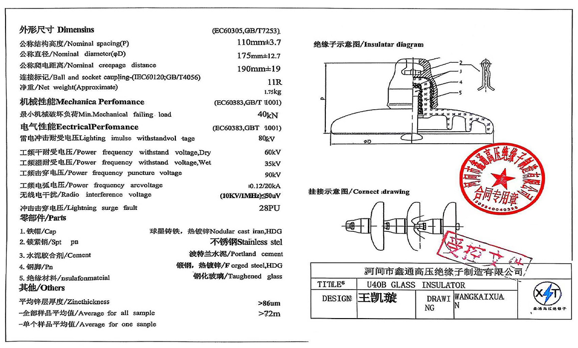 U40B is a standard suspension tempered glass insulator, mainly used in power transmission and distribution lines of power systems to support wires and isolate currents. It is one of the commonly used insulation components in medium and low voltage power grids.