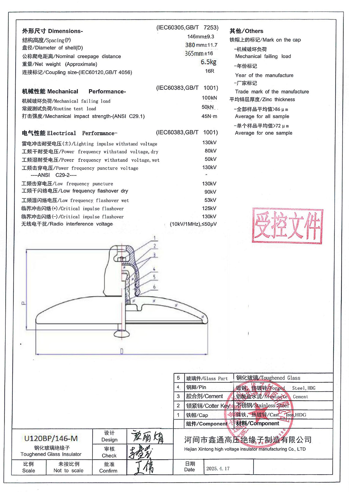High strength and reliability: The "U120" in the model represents a rated mechanical and electrical failure load of up to 120kN, with high mechanical strength and the ability to withstand harsh mechanical stresses such as wire tension, wind load, and ice load. Tempered glass insulation components themselves have the characteristic of "zero self explosion". Once internal defects or breakdown occur in the insulation, they will all break and fall off, making it easy for inspectors to detect from a distance without the need to climb the tower and inspect each piece, greatly improving operation and maintenance efficiency and safety.
